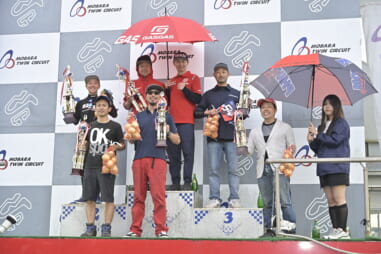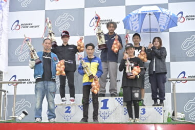 ↑ 表彰はレース1、レース2のポイントを合算した順位で行われる。中央は総合1位の小原堅斗(#1)。左はレース1、2共に2位を獲得した五十住洋佑(#06)。右は総合3位の新井誠(#05)